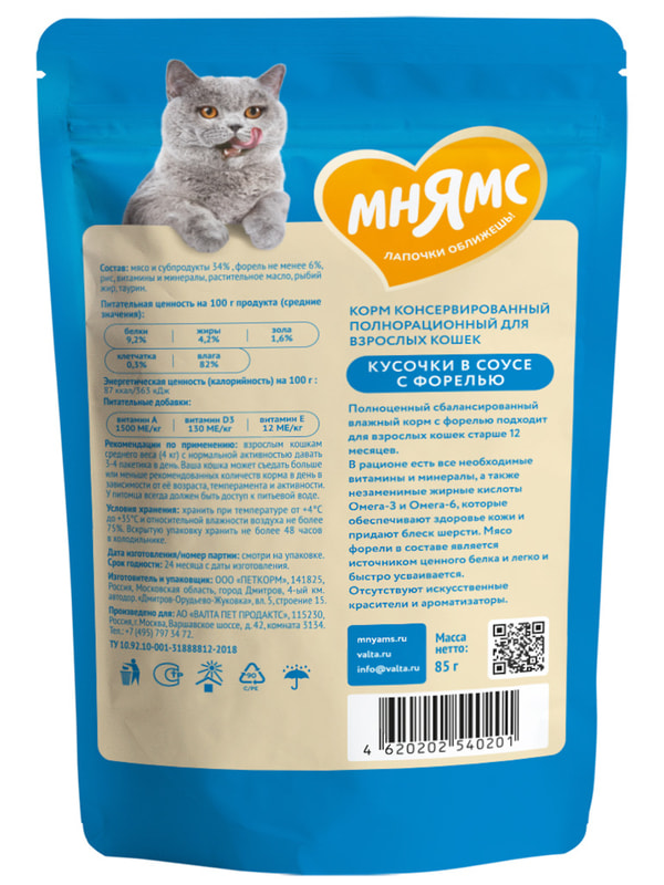 Высококачественный полнорационный сбалансированный влажный корм с форелью подходит для взрослых кошек старше 12 месяцев.