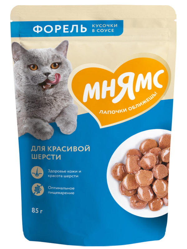 Повседневные корма Мнямс Влажный корм Мнямс Кусочки в соусе с форелью для красивой шерсти кошек 85г