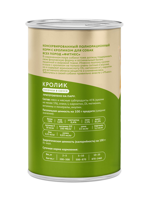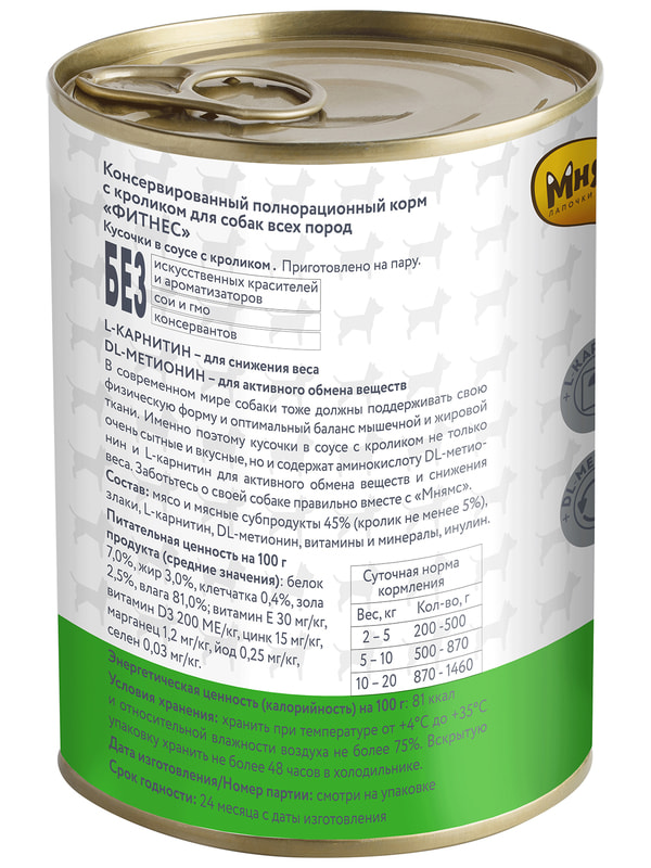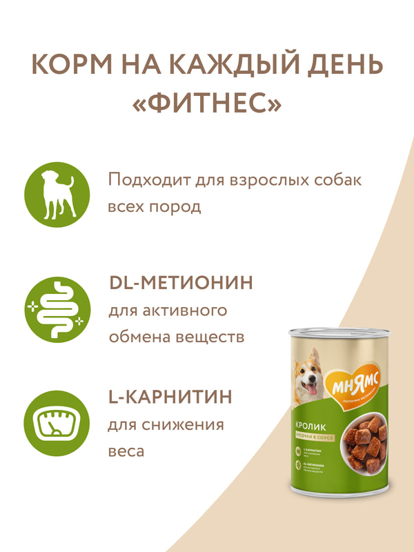 В современном мире собаки тоже должны поддерживать свою физическую форму и оптимальный баланс мышечной и жировой ткани. Именно поэтому кусочки в соусе с кроликом не только очень сытные и вкусные, но и содержат аминокислоты L-carnitine и DL-метионин для активного обмена веществ и снижения веса. Заботьтесь о своей собаке правильно вместе с «Мнямс».