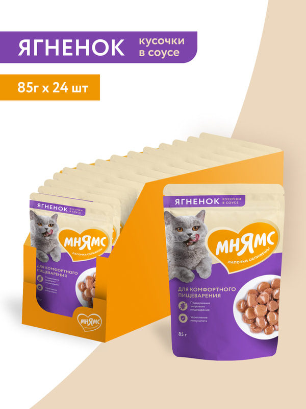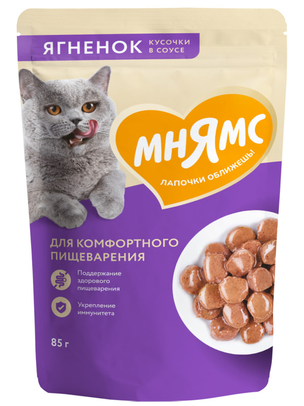 Повседневные корма Мнямс Влажный корм Мнямс Кусочки в соусе с ягненком для комфортного пищеварения у кошек 85г