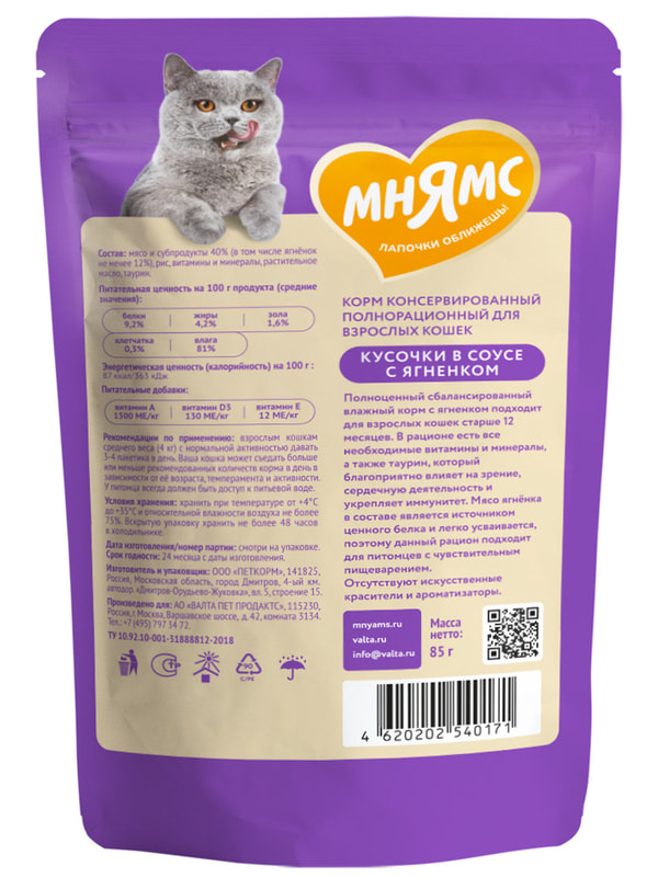 Высококачественный полнорационный сбалансированный влажный корм с ягненком подходит для взрослых активных кошек старше 12 месяцев.