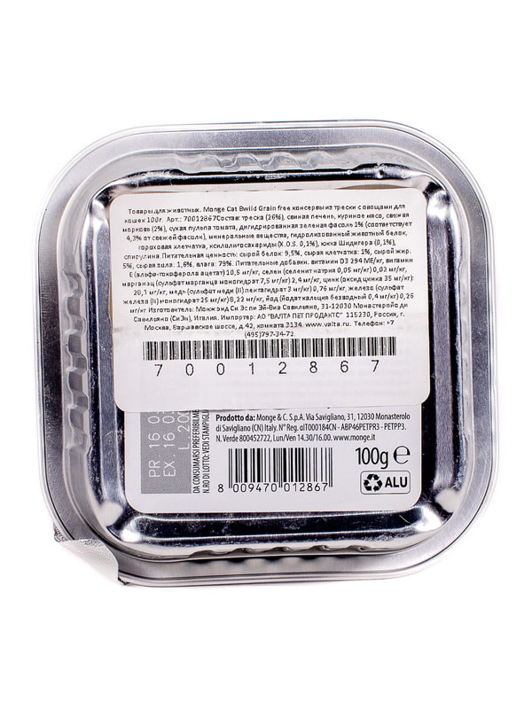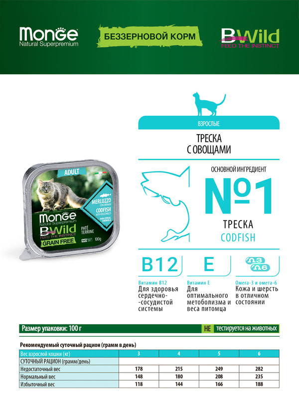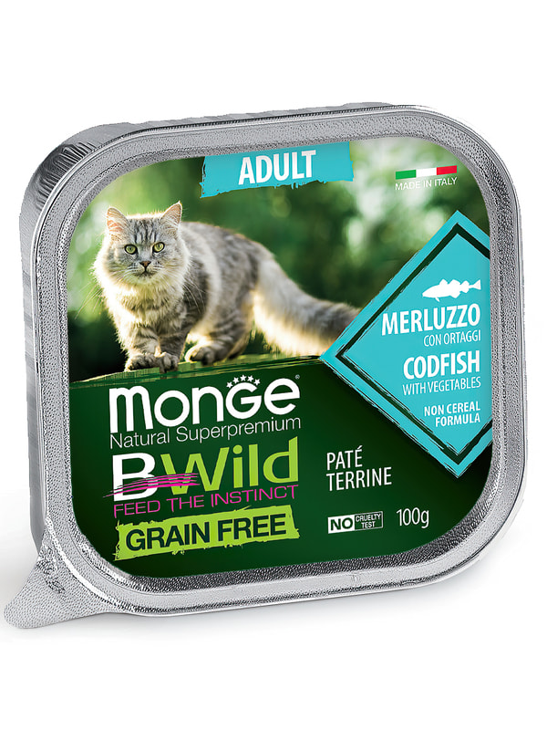 Monge (Монж) Cat BWild GRAIN FREE (холистик) полнорационные беззерновые консервы из трески с овощами для взрослых кошек и котов 100 г.