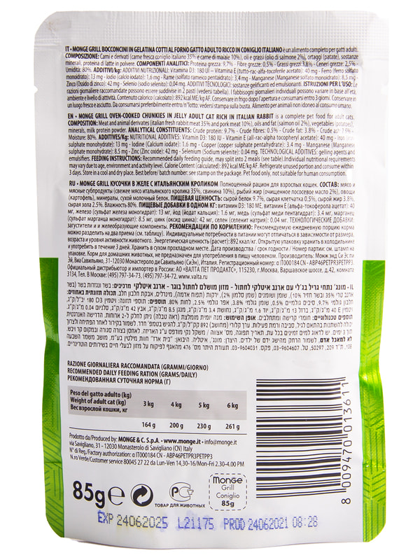 Monge (Монж) Cat Grill полнорационные беззерновые паучи из мяса итальянского кролика для взрослых кошек и котов 85 г.