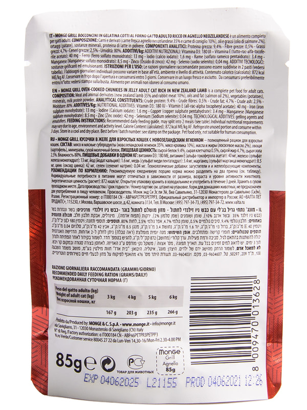 Monge (Монж) Cat Grill полнорационные беззерновые паучи из новозеландского ягненка для взрослых кошек и котов 85 г.