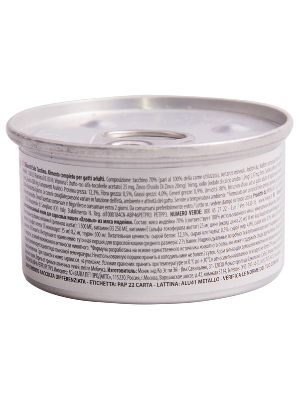 В состав консервов входит один источник белка животного происхождения (мясо индейки), что позволяет легко исключить из рациона ингредиенты, вызывающие аллергию.