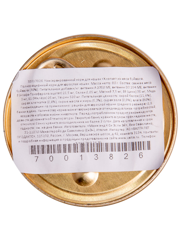 Свежее мясо буйвола 70% (соответствует 100% используемого мяса), минеральные вещества.Питательная ценность: сырой белок 11,4%, сырая клетчатка 0,6%, сырые масла и жиры 5,3%, сырая зола 0,8%, влажность 80%.Энергетическая ценность: 983 ккал/кг.Питательные добавки в 1 кг: витамин А (ретинола ацетат) 2750 МЕ, витамин D3 154 МЕ, витамин Е (альфа-токоферола ацетат) 15,5 мг, селен (селенит натрия 0,10 мг) 0,05 мг, марганец (сульфат марганца моногидрат 23 мг) 7,5 мг, цинк (оксид цинка 43,8 мг) 35 мг, медь (сульфата меди [II] пентагидрат 11,7 мг) 3 мг, железо (сульфата железа [II] моногидрат 75,9 мг) 25 мг, йод (йодат кальция безводный 0,6 мг) 0,4 мг, таурин 500 мг, натрий 0,24%, кальций 0,36%, фосфор 0,14%, магний 0,01%.