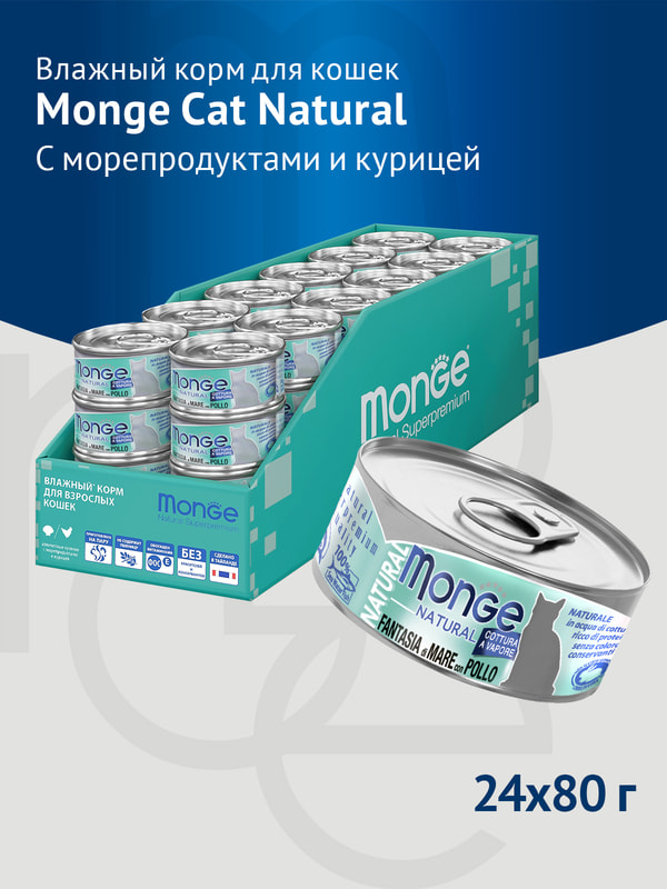 Повседневные корма Monge Влажный корм Monge Cat Natural для кошек, с морепродуктами и курицей, консервы 80 г