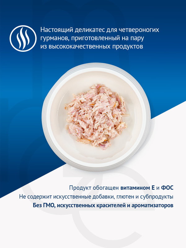 Настоящий деликатес для четвероногих гурманов приготовленный на пару из высококачественных продуктов на основе морепродуктов и курицы, который является источником белка высокой пищевой ценности.