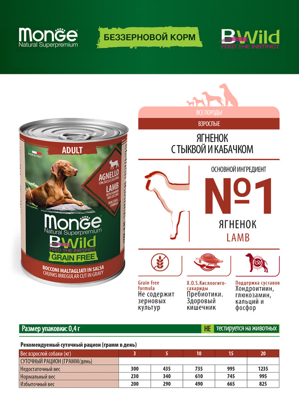 Monge (Монж) Dog BWild GRAIN FREE (холистик) полнорационные беззерновые консервы из мяса ягнёнка с тыквой и кабачками для собак всех пород 400 г.