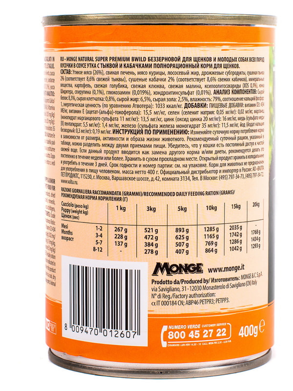 Monge (Монж) Dog BWild GRAIN FREE Puppy&Junior беззерновые (холистик) полнорационные беззерновые консервы из мяса утки с тыквой и кабачками для щенков 400 г.