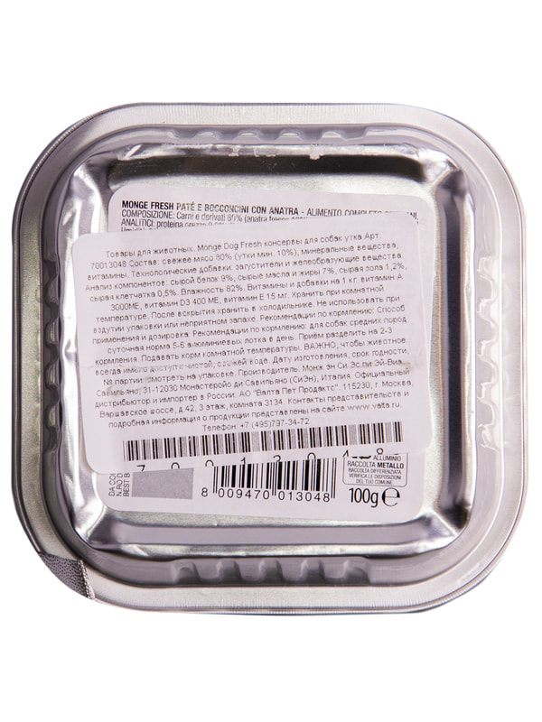 Повседневные корма Monge Влажный корм Monge Dog Fresh для собак, с уткой, консервы 100 г