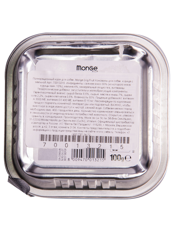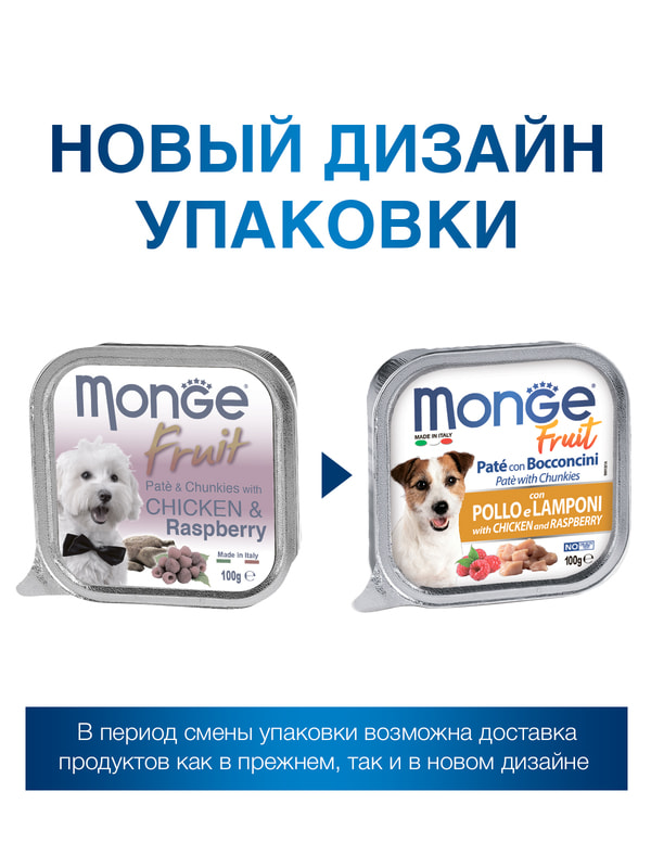 Monge (Монж) Dog Fruit полнорационный влажный корм с мясом курицы и малиной для взрослых собак всех пород 100 г.Аппетитные мясные кусочки курицы в паштете со спелой малиной из отборных ингредиентов высокого качества для взрослых собак.
