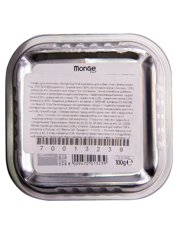Monge (Монж) Dog Fruit полнорационный влажный корм с мясом утки и апельсином для взрослых собак всех пород 100 г.