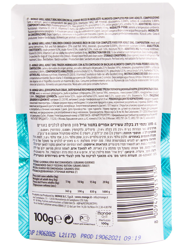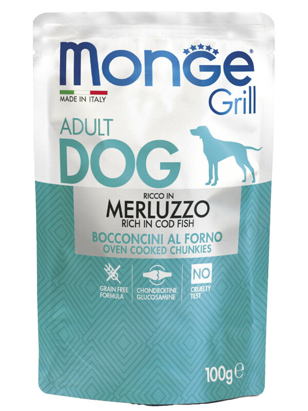 Monge (Монж) Dog Grill полнорационный беззерновой влажный корм с треской для взрослых собак всех пород 100 г.Нежные кусочки в аппетитном соусе из отборных ингредиентов высокого качества с треской для взрослых собак всех пород.