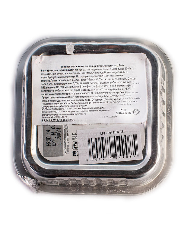 Monge (Монж) Dog Monoprotein Solo полнорационный беззерновой влажный корм из тунца для взрослых собак всех пород 150 г