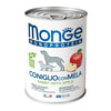 Monge (Монж) Dog Monoprotein Fruits полнорационный беззерновой влажный корм из мяса кролика с яблоком для взрослых собак всех пород 400 г.Ароматный мясной паштет из кролика с яблоком для собак, который содержит только один источник белка животного происхождения (кролик), тапиоку (в качестве источника углеводов) и сочное яблоко, которое является источником витаминов и минералов, а также богато клетчаткой, полезной для здоровья кишечника и пищеварения.GRAIN FREE формула и один источник белка животного происхождения в составе корма позволяют легко исключить из рациона ингредиенты, вызывающие аллергию.Без ГМО, искусственных красителей и ароматизаторов. Сделано в Италии.