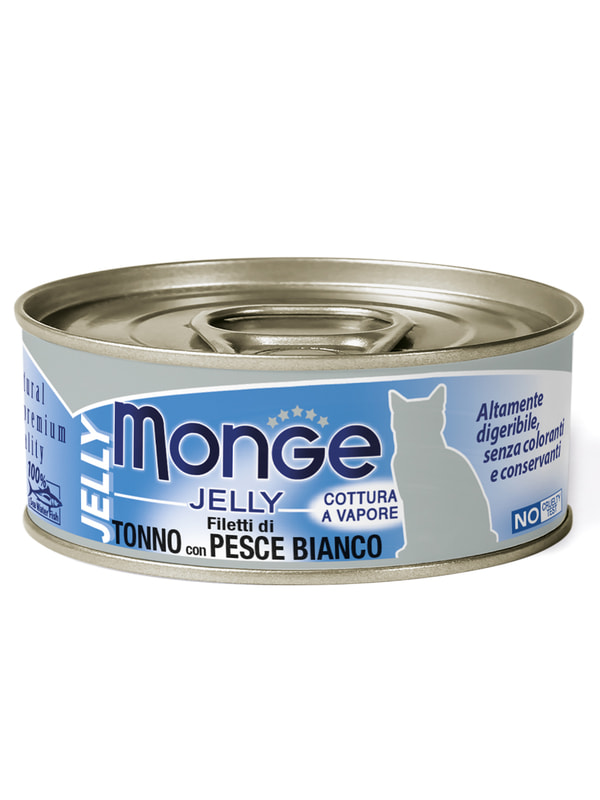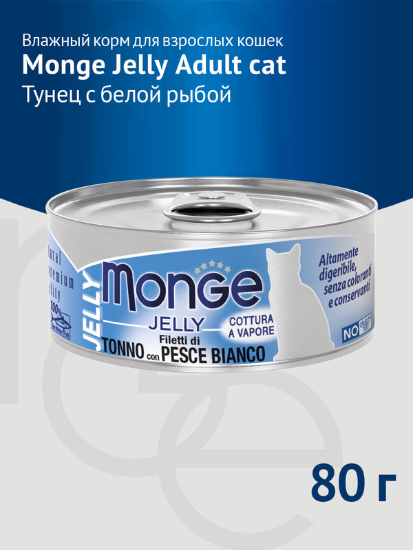 Повседневные корма Monge Влажный корм Monge jelly Adult cat для взрослых кошек с желтоперым тунцом и белой рыбой, консервы 80 г