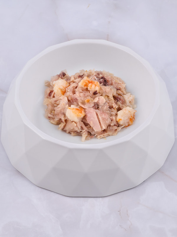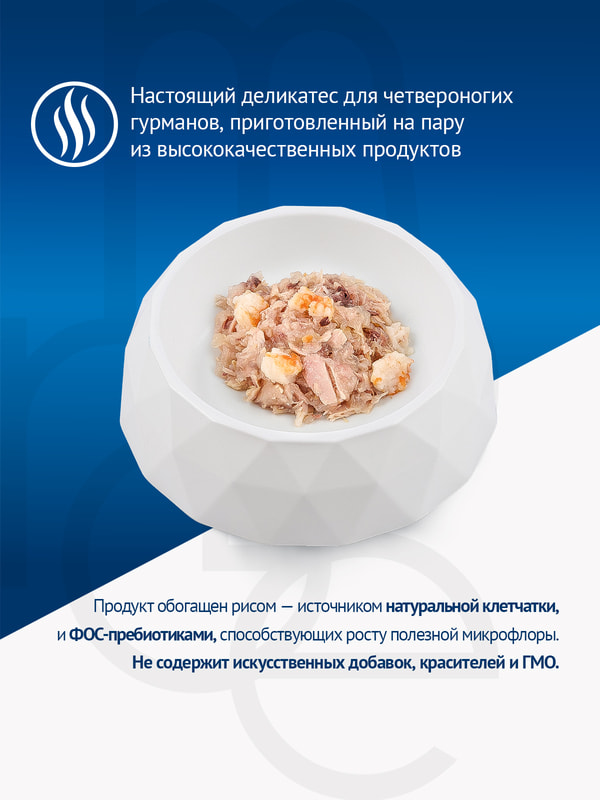 Ингредиенты: Желтоперый тунец (Thunnus Альбакарес) 46,25%, сурими (Nemipterus spp.,Priacanthus spp., Cypselurus spp.) 6,25%, рис, F.O.S. (фруктоолигосахариды).
