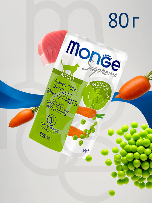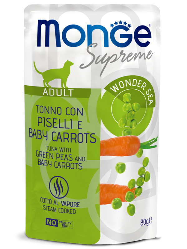 Влажный корм Monge Supreme Adult cat для взрослых кошек с зелёным горошком и мини-морковью, паучи 80 г
