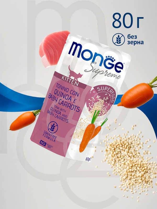 Повседневные корма Monge Влажный корм Monge Supreme kitten для котят из тунца с киноа и мини-морковью, паучи 80 г
