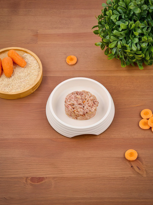 Тунец 55%, киноа 4%, мини-морковь 4%, очищенное подсолнечное масло, тапиока, фруктоолигосахариды (ФОС) 0,04%.Питательная ценность: сырой белок 16%, сырая клетчатка 0,1%, сырой жир 2%, сырая зола 2%, влага 78%.Энергетическая ценность: 953 ккал/кг.Питательные добавки в 1 кг: витамин Е (альфа-токоферол) 50 мг.