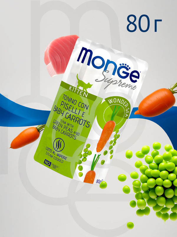 Повседневные корма Monge Влажный корм Monge Supreme kitten для котят из тунца с зелёным горошком и мини-морковью, паучи 80 г