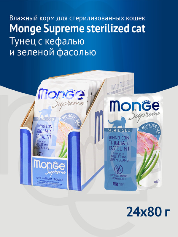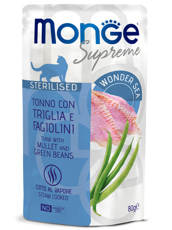 Влажный корм Monge Supreme sterilized cat тунец с кефалью и зелёной фасолью 80 г. Дополнительный консервированный корм для стерилизованных кошек.