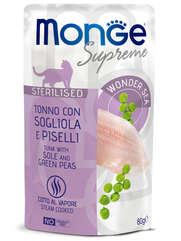 Влажный корм Monge Supreme sterilized cat тунец с желтоперой камбалой и зелёным горошком 80 г. Дополнительный консервированный корм для стерилизованных кошек.
