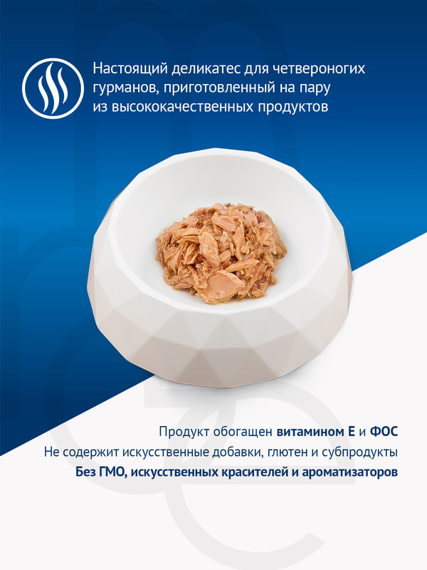 Настоящий деликатес для четвероногих гурманов приготовленный на пару из высококачественных продуктов на основе свежего тунца, который является источником белка высокой пищевой ценности.