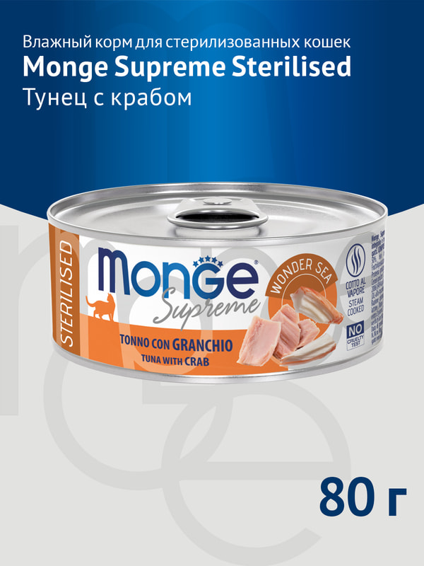Повседневные корма Monge Влажный корм Monge Supreme sterilized для стерилизованных кошек из тунца с крабом, консервы 80 г