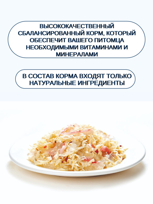 В состав корма входят только натуральные ингредиенты: курица и крабы, которые являются источником белка, необходимого для поддержания мышечной массы и здоровья кожи и шерсти. В составе также присутствует скумбрия, богатая омега-3 жирными кислотами, которые положительно влияют на работу сердца и сосудов.