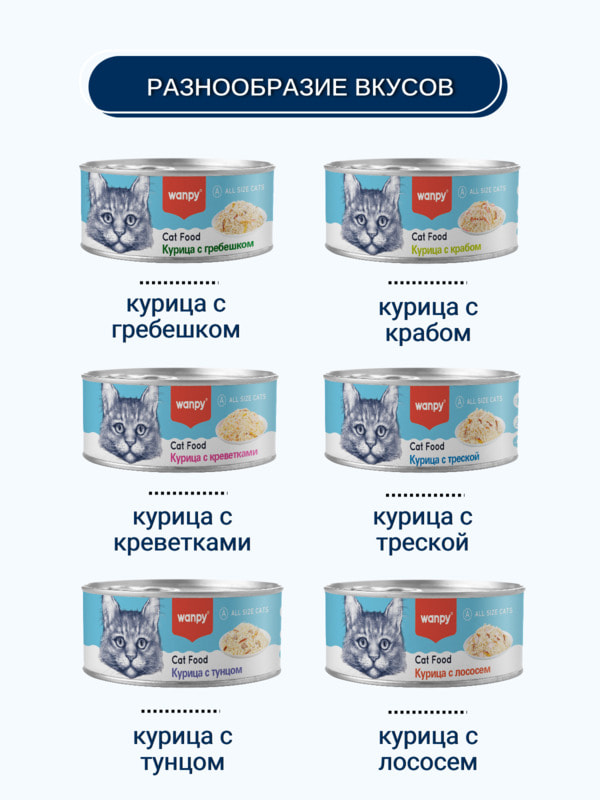 Wanpy Cat консервы для кошек "Курица с крабом" - это высококачественный сбалансированный корм, который обеспечит вашего питомца необходимыми витаминами и минералами.