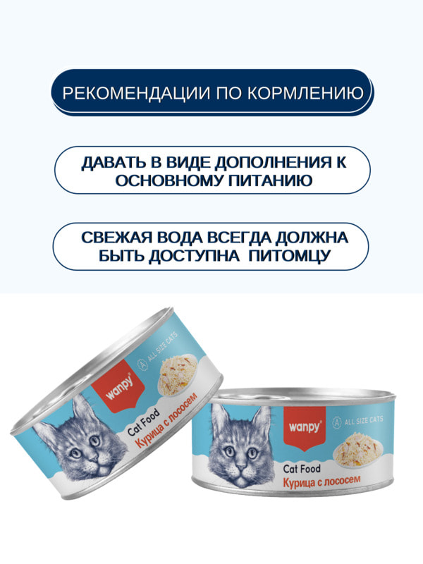 Wanpy Cat консервы для кошек "Курица с лососем" - это высококачественный сбалансированный корм, который обеспечит вашего питомца необходимыми витаминами и минералами.