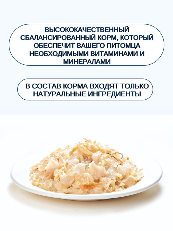 В состав корма входят только натуральные ингредиенты: курица и треска, которые являются источником белка, необходимого для поддержания мышечной массы и здоровья кожи и шерсти. Скумбрия обогащает корм омега-3 жирными кислотами, которые положительно влияют на работу сердца и сосудов.