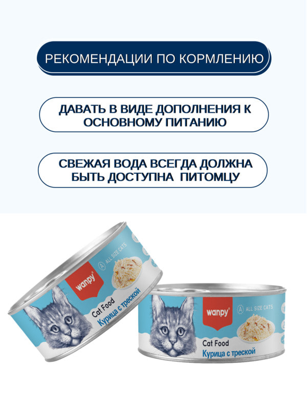 Wanpy Cat консервы для кошек "Курица с треской" - это высококачественный сбалансированный корм, который обеспечит вашего питомца необходимыми витаминами и минералами.