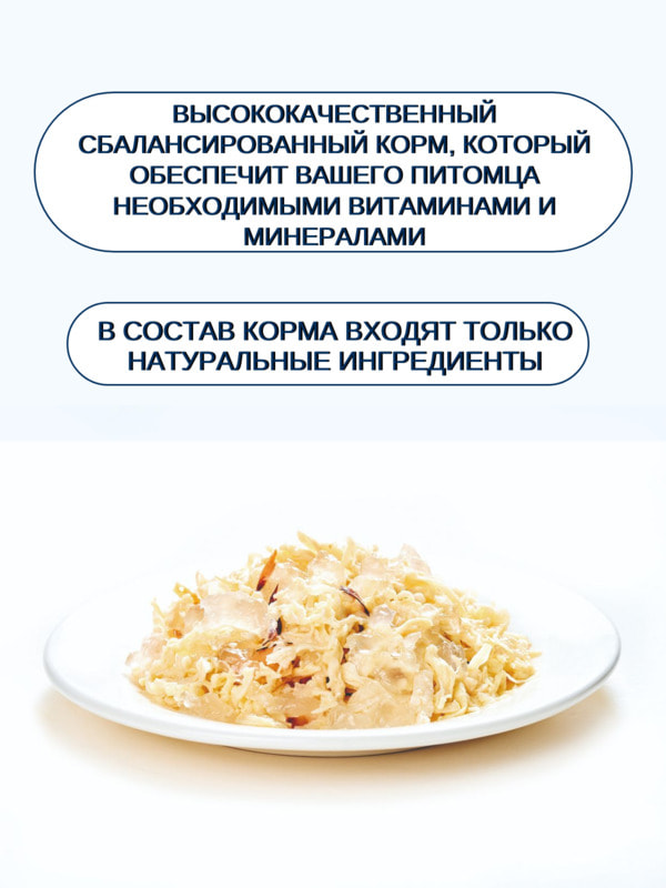 В состав корма входят только натуральные ингредиенты: курица и тунец, которые являются источником белка, необходимого для поддержания мышечной массы и здоровья кожи и шерсти. Скумбрия обогащает корм омега-3 жирными кислотами, которые положительно влияют на работу сердца и сосудов.