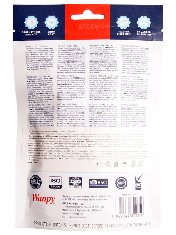 Wanpy Лакомство Cat «сердечки» из курицы с треской, для кошек, 80 г.