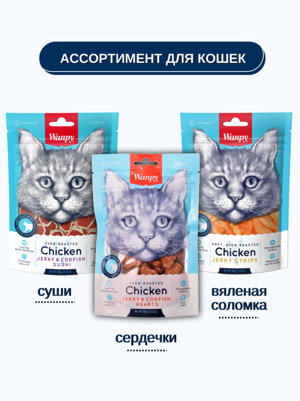 Повседневные Wanpy Wanpy Cat Лакомство для кошек «сердечки» из курицы с треской 80 г