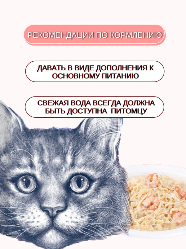 В состав входят только натуральные ингредиенты. Курица и креветки, служат источником белка, необходимого для поддержания мышечной массы и здоровья кожи и шерсти.