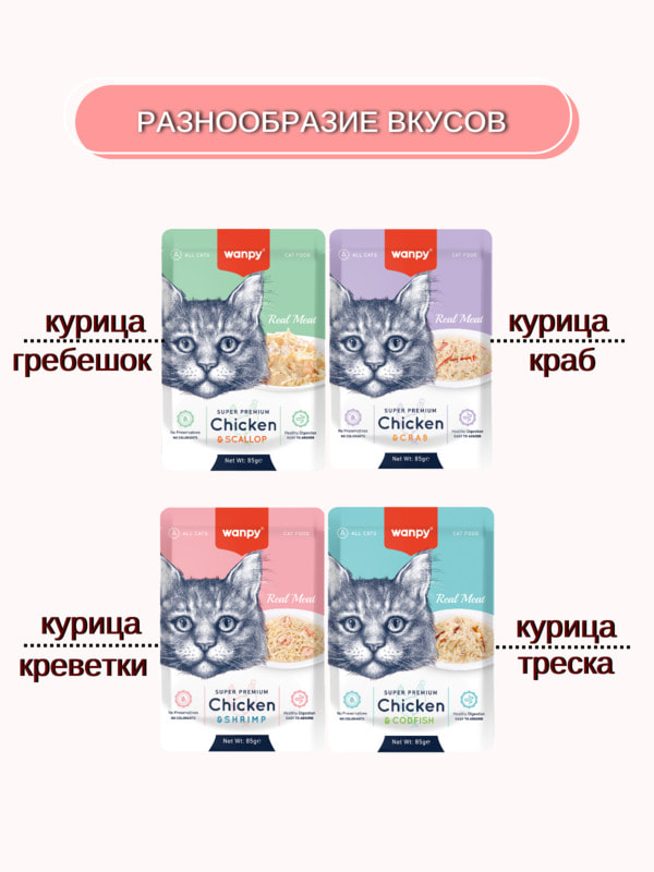 Wanpy Cat пауч для кошек с кусочками курицы и креветками - это высококачественный сбалансированный корм, который обеспечит вашего питомца необходимыми витаминами и минералами.