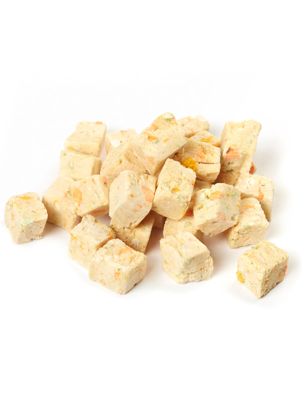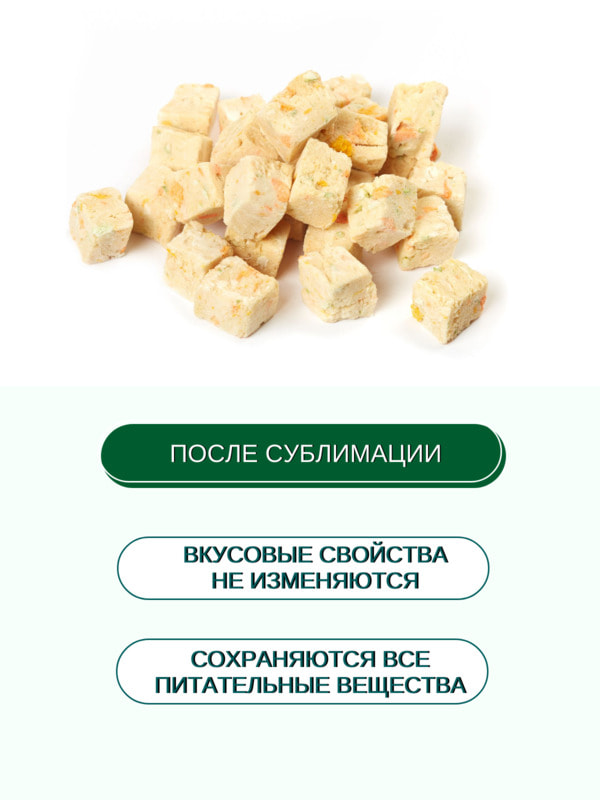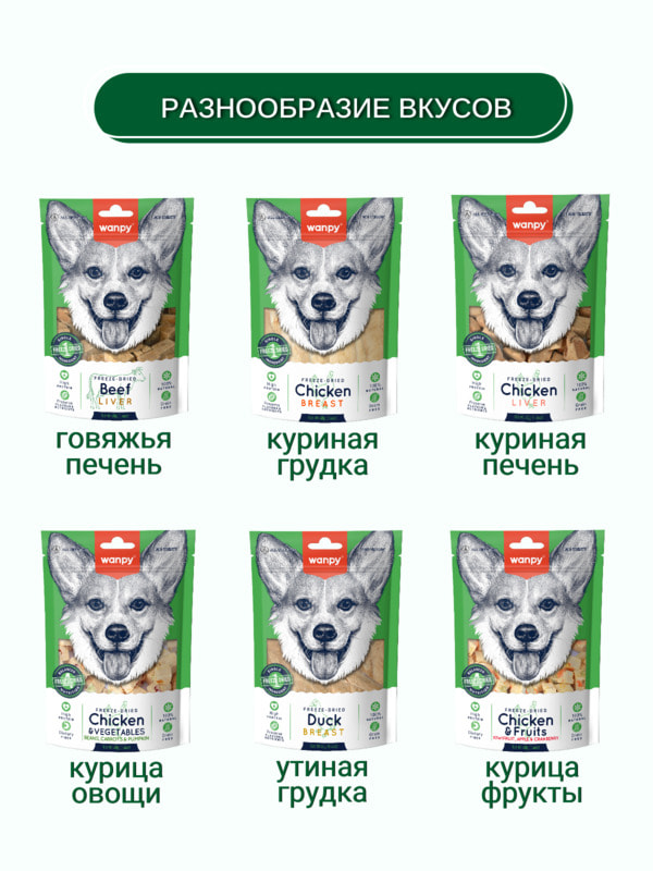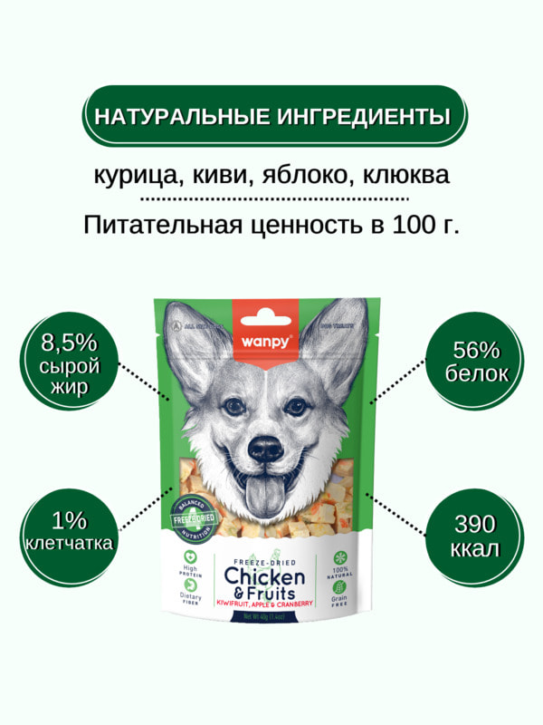 Wanpy Dog сублимированное лакомство для собак "Курица и фрукты" - это уникальное и полезное угощение, которое сделает день вашего питомца ярче и вкуснее.