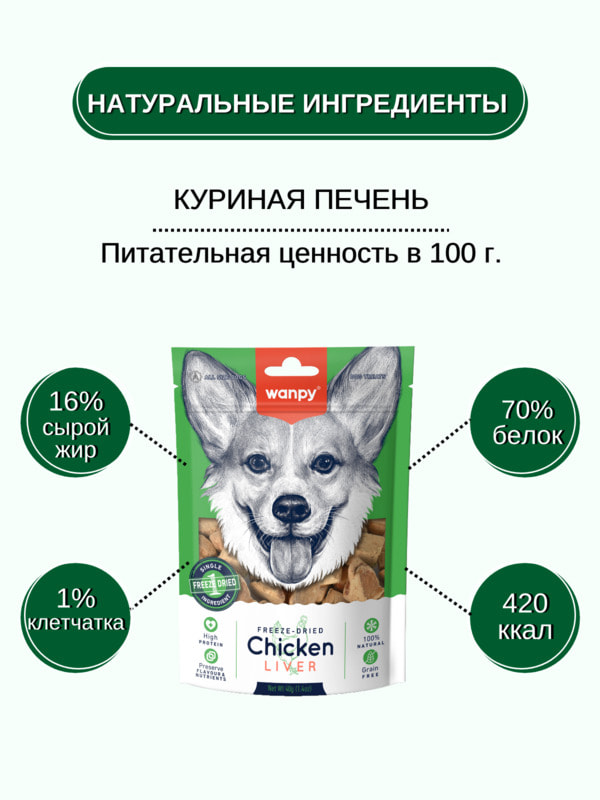 Wanpy Dog сублимированное лакомство для собак "Курица и печень" - это уникальное и полезное угощение, которое сделает день вашего питомца ярче и вкуснее.
